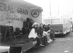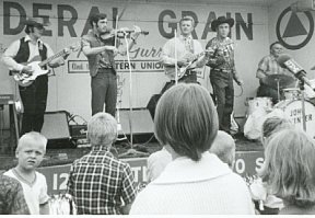 Russ Gurr recording the Federal Grain Train Around this same time, Federal Grain Company were looking for a way to exhibit their products and services at Western Canada fairs and exhibitions. The performing, emceeing, and songwriting abilities of Russ were brought to their attention and they offered him a series of summer contracts. The summer shows that followed evolved into full-fledged Western Canadian tours in which we spent many summers travelling to fairs large and small in a convoy consisting of two motor homes, an instrument truck, station wagon, and a stage on wheels. Russ had designed a combination outdoor stage and parade float on a flat bed trailer. Our routine was pretty much the same for each venue. We arrived in the city/town the night before their fair, meeting the local Federal Grain agents who opened their homes to us and treated us royally with barbecues and warm hospitality. We usually met with the local fairboards and media for which we did TV / Radio / Newspaper interviews. For the opening day parade, the local agent would pull our float which consisted of a flat bed trailer, covered with artificial turf and signage. Our sound system was powered by a gas generator and we performed standing, non-stop during the entire parade, some of which lasted almost two hours. The hazards on these routes were many: blazing hot sun, wind, cold, rain, hail, sudden unbalancing starts and stops, hills, potholes, runaway horses, mosquitoes, float "hitchhikers," inebriated drivers and spectators, lost kids, laryngitis, broken guitar strings, and fatigue. For the first few years we took turns singing at the mike, but then Russ wrote and recorded a theme song: "The Federal Grain Train," for his first record album. After that, Russ sang the same song, non-stop, during the entire parade. We all had short vocal and instrumental parts in the song but his performances of this song must have set some sort of Guinness record for length and endurance. We were loud. Occasionally, the parade marshalls would place a brass or pipe band near us in the parade line-up. When we suggested a better location, they seldom heeded our warnings, but invariably, in such cases, the length of the parade would stretch out as the marching bands moved farther and farther away from us.