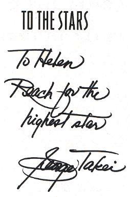 These are from the first time I met George Takei. I was only supposed to get one thing signed (see above), but since I had his book in my hand, he snatched it, asked my name and wrote: "To Helen, Reach for the highest star, George Takei". But he writes that same message a lot. LOL