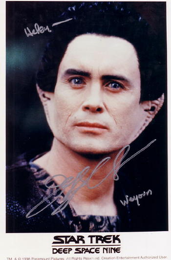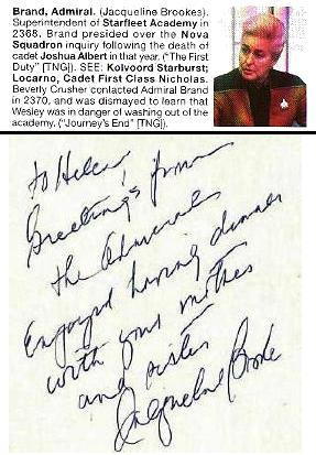 Jacqueline Brookes—My mom and sister met her on a train a few years back. They recognized her from other things, but she told them she was on Star Trek: The Next Generation. I knew exactly who she was, though I hadn’t known her name. LOL—it says "To Helen, Greetings from the Admiral. Enjoyed having dinner with your Mother and Sister. Jacqueline Brookes".