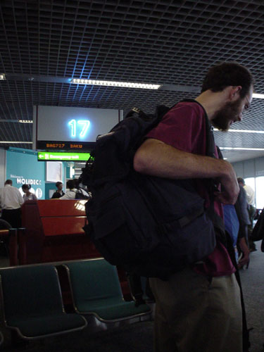 Dave at Heathrow We had a short layover in London (staying in Heathrow) and then flew to Almaty via Baku, Azerbaijan.