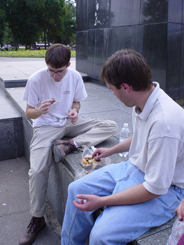 Chris and Scott by a Statue in Almaty They're eating shashlik (lamb kabob) from a bag!