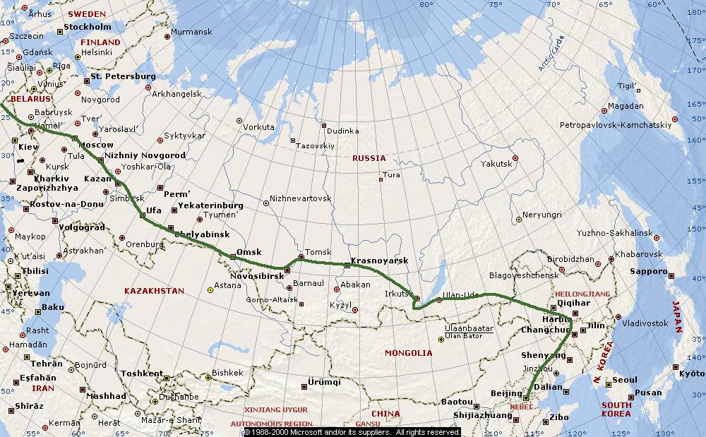 A trip made from Beijing to Warsaw on the Transiberian Railway in February 1991.