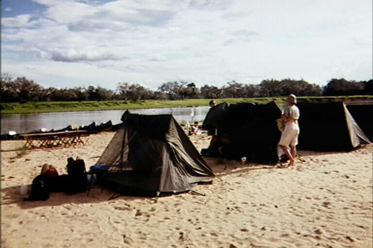 Setting up camp for the night. It was warned to sleep INSIDE the tents, no matter how hot it was. Hippos (again) are the problem, as they wander from the river to the shore and if you are sleeping out, they can simply step on you. As they weigh a ton or more this is not good. The tents are seen as more of a solid object by them and they go around.