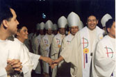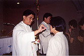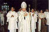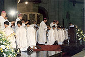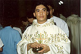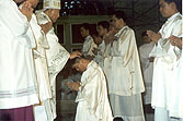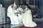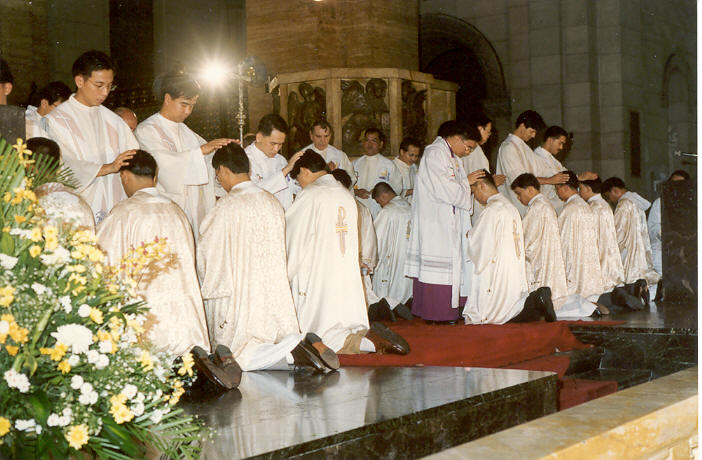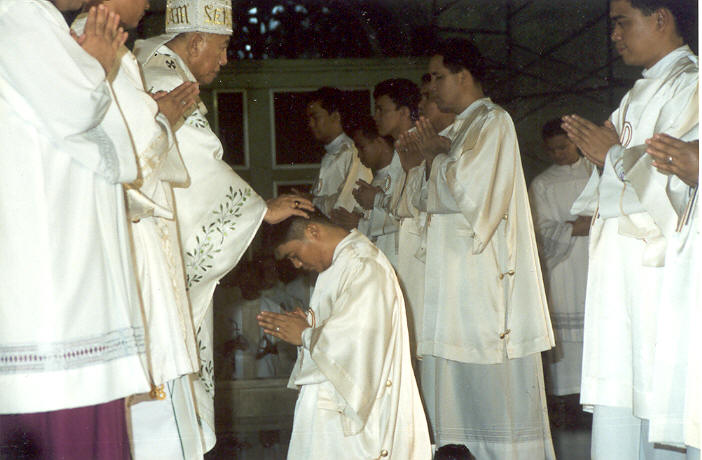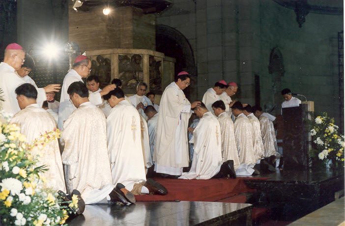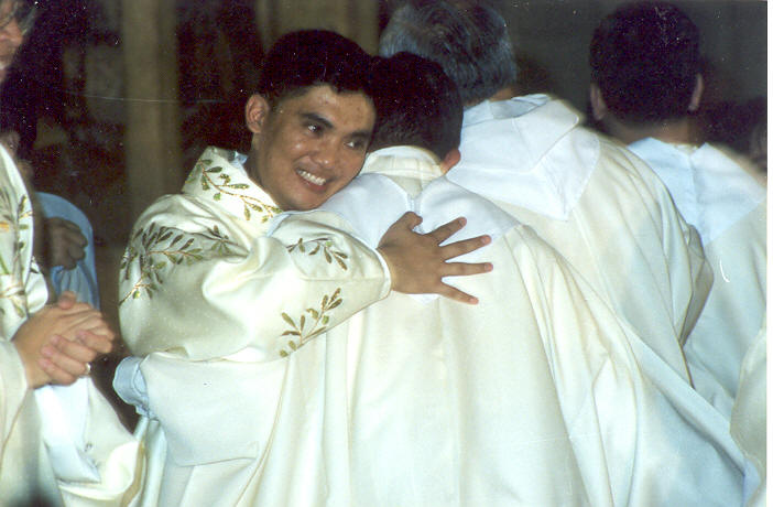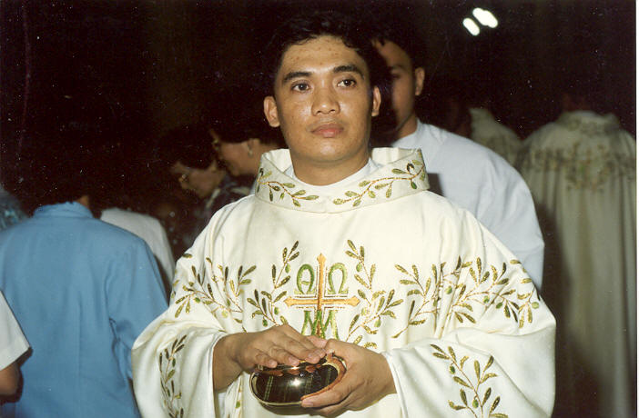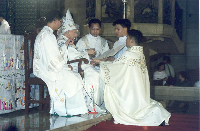 The 12 photographs portrayed below were taken during the ordination of Fr. Greg Ramos as a Catholic priest. He was ordained with a number of other seminarians who have similarly completed their studies and training for the priesthood. The ordination rites were held on July 31, 1996 at the Manila Cathedral and the ordaining prelate was Manila Archbishop Jaime Cardinal Sin. In attendance were archbishops, bishops, priests, as well as friends and relatives of the newly ordained priests. The ordination marked Fr. Greg's completion of the five years he spent studying at the Holy Apostles Senior Seminary in Guadalupe, Metro Manila. Fr. Greg's parents, two sisters, a younger brother and other relatives and friends were present during his ordination.
