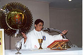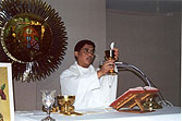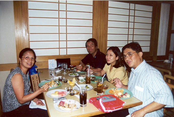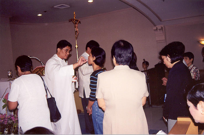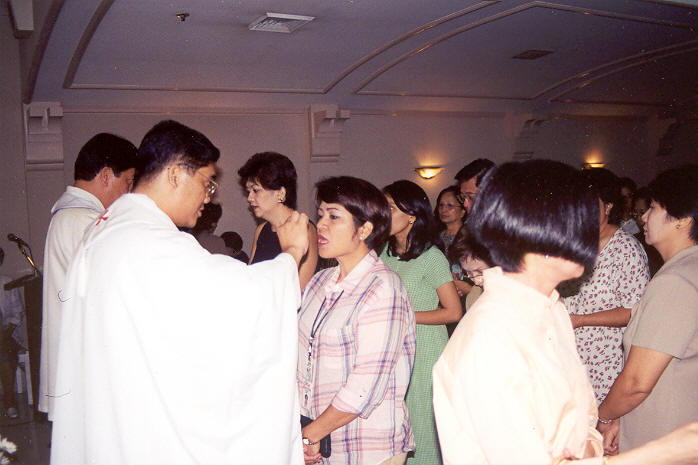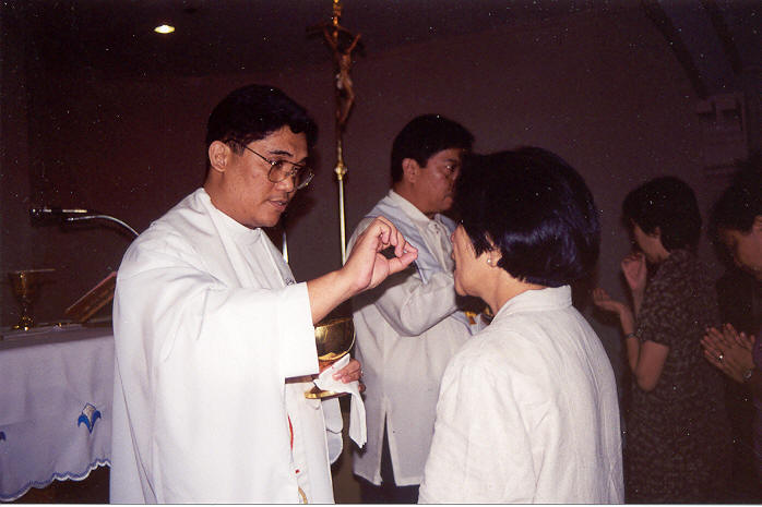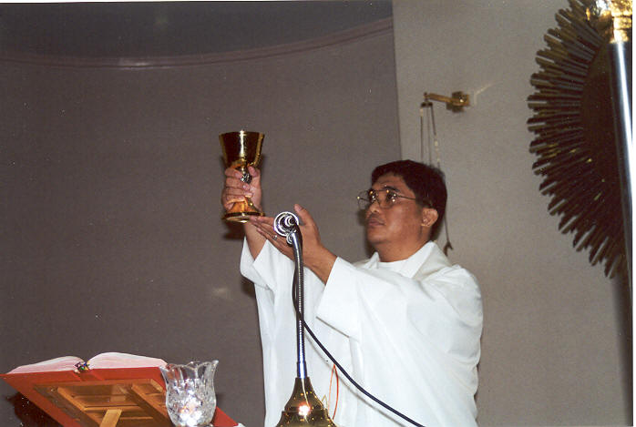 The first set of 12 photographs shown below were taken by the "Hawaiian WebMaster" during a mass which Fr. Greg celebrated last September 27, 2000 at the Chapel of The Eucharistic Lord. The chapel is located at the fifth floor (Bldg B) of the Shoe Mart Megamall Shopping Center, Epifanio DeLos Santos Avenue, Pasig City where Fr. Greg celebrates his noon mass every Wednesday. Two of the photographs show the main entrance to the beautiful chapel and a view of what is seen inside. Also portrayed are some of those who came to attend the mass and join in receiving Holy Communion. Right after the mass, we invited Fr. Greg to join us for lunch at a nearby Japanese restaurant. Also with us were Alex Quirante and Imelda Del Mundo who were the ones who wrote the article about Fr. Greg, and Mrs. Nena La Putt from Honolulu, Hawaii. (NOTE: Click on any of the "thumbnail images" to see a larger photograph format).