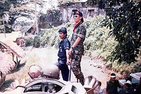 The soldiers who were heading for the barracks to get their rifles were caught behind the trees. I then realized that I've been badly hurt and time was running out on me. There were so many things going on in my mind but I could not do anything. Blood was oozing out of my body and pain was starting to take its toll on me. The soldier, who apparently had run amuck, was still walking back and forth close to where we we lay wounded. He was still firing his rifle in every direction and was only interrupted by quick magazine changes and when he started firing rounds from his grenade launcher. I felt that if I moved too much (like apply pressure to my wound or attempt to crawl), it'll just get his attention and he might just finished me off for good. I was also thinking of reaching for the Cal 45 pistol but I could not move even for an inch.