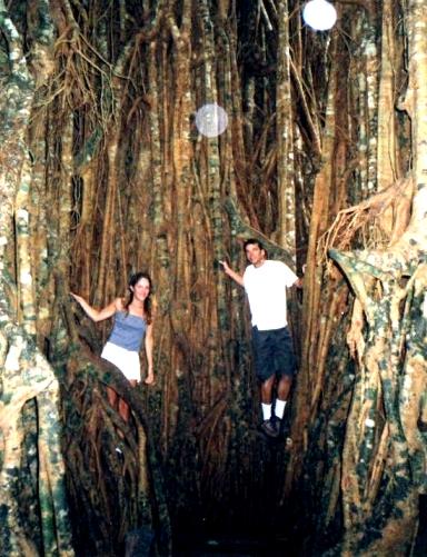 The area around Cairns is often called the Tropical Northland. Vast rainforest carpets much of the area and narrow dirt roads are often impassible except by 4 wheel drive vehicles. We spent several days exploring the beauty of the area, luckily managing to avoid the torrential downpours that often occur during the rainy season. A two day trip into the Atherton Tablelands provided us with views of spectacular waterfalls, many of which we swam in despite the FREEZING temperatures. The forest itself was amazing, especially the giant fig trees which can dominate an area. We also went canoeing on a lake in the middle of the rainforest, stopping to gaze at the unusual rainforest wildlife that lived near the water. Our canoe trip ended in a small creek where we painted each other's faces with Okra, a natural rock that Aborigines use to decorate themselves for ceremonies. That night at the "On the Wallaby" Lodge, Kate tried to master the didgeridoo, a Aboriginal musical instrument which is VERY hard to play. A second trip into the rainforest took us into croc territory for the first time. We spent hours trail hiking through the jungle, at one point stopping to cool off in a stream. We were told that crocs lived in the stream but we managed OK without seeing any. Our rainforest experience ended with big adventure - whitewater rafting in the middle of a cyclone. They almost decided to close the river as the water was getting so high, but we went anyway and battled our way down the rapids without casualty.