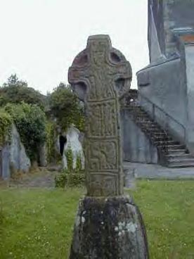 High Cross As early as 1180 an Irish Chief, Dermot O'Riain wished to build an abbey here for 'God, Saint Mary and Saint Benedict', in other words, a Benedictine Abbey. In 1166 the Normans, led by Strongbow, conquered Leinster and became landlords. Thus shattering his plans. William, the Earl Marshall, was the second richest man in England and he was a great benefactor of the Cistercian Order there. He wanted to build an abbey in Ireland. When he died his friend Philip de Prendergast knew about this desire and the Cistercian Order granted him permission to build one provided certain conditions were met. Several sites were investigated and finally in 1204 the site for the abbey was chosen at Bun Dubhuisce. In 1204 after a wooden cross was erected, the first tree was felled and the first sod was cut to excavate the site for Saint Saviour's Cistercian Abbey, Graignamanagh. The team of monks who built the abbey lived one mile west of the present site, where some monks also farmed. This was at Old Grange. Here McMurrough had begun to build a church but it was never finished, so the monks roofed it over and erected more farm buildings to accommodate their needs. These three centres were the economic units from which Duiske Abbey rose and because of their farming enterprises, they were called Granges. Grange comes from the Latin word 'Grangii' meaning barn; hence they had Annamult Grange, Cuffes Grange (also called Grange Castri) and Old Grange. In the 1970s the locals began restoring the church and it is now used by the local parish. Although the present floor level is about 2m above that of the original. In the baptistry, just off the S aisle, there is a very fine doorway of 13th century date, and the effigy of a knight of similar date is preserved in the church. In the graveyard there are two crosses. Figured scenes on the north cross include David, the Sacrifice of Isaac and the Fall of Man. The cross has a solid ring and is about 2.3m high with a high base. The south cross, which is about 2m high, also has a solid ring and is carved with a Crucifixion and panels of interlace. |