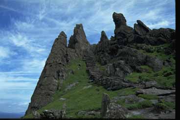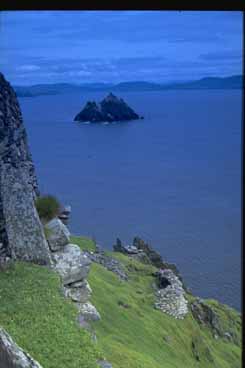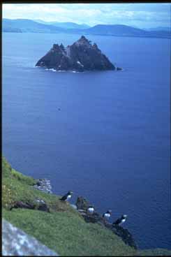 SKELLIGS-RING OF KERRY From Killarney pass through Killorgan (Famed for the puck fair), Glenbeigh (see the Staigue Stone Fort), Cahirdaniel (where Daniel O'Connell our liberator was born), Cahirciveen and venture onto Valencia Island where the first trans atlantic cable was laid. From Valencia you can go to the Skelligs, a 1000 foot rocky ourcrop where on sits a monestary from about the 8th C. You can climb the multitude of steps to visit the oratory, churches and crosses on the very top. The Skelligs are also famous for seeing puffins who are so tame that they will come right up to you. Puffin Skelligs |