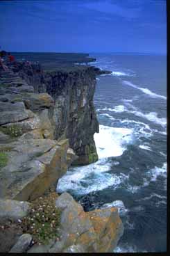 ARAN ISLANDS The Aran Islands present to you one of the most unique and oldest surviving traditions in the Irish way of life. The islands are famed for their curraghs (small tar covered fishing boats), aran jumpers, stone walls and of course the unique scenery and tranditions. Many of our most famous literary figures came from here. On this tour you will see the stone walls criss cross the small holdings, the tatched cottages, the ancient but magnificent fort of Dun Aengus, perched high on the atlantic cliffs (1000BC). The older fort of Dun Eochla and Dun Duchathair (3000BC), a ruined monestary from the 7th century, some wedge tombs and several churches and crosses. The fishing village of Kilcrohan now houses a heritage center where you can gain and insight and understanding to life on Aran and it is and as it was. Cliffs near Dun Aengus One ofthe nice things about the Aran Islands is that it is just a 20 min Ferry ride from Doolin. Overnight you can enjoy some traditional music and sleep with the sound of the atlantic ocean pounding the rocks. If you don't feel energetic enough to walk to the sites you can always take the jaunting car. (Horse drawn buggy). |