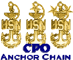 The CPO Anchor Chain was formed to link together CPO member's web pages. The Ring is for all those who are interested in viewing pages dealing with Naval and/or Nautical themes. All Chief Petty Officers "World Wide," both active duty and retired are eligible for membership in this ring. (Once a Chief always a Chief)