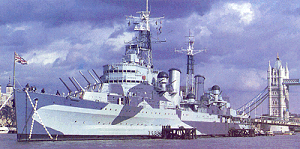 HMS Belfast, a cruiser moored on the River Thames and within easy walking distance of the Tower of London and Tower Bridge. She was launched in March 1938 and served throughout the Second World War, playing a leading part in the destruction of the German battlecruiser Scharnhorst at the Battle of North Cape, the Normandy Landings and in the Korean War.