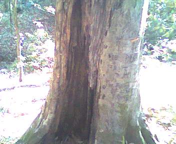 This hollow beech tree has been damaged by selfish, unthinking park visitors. Beech trees such as this have thin bark which is easily damaged by people carving their initials.
