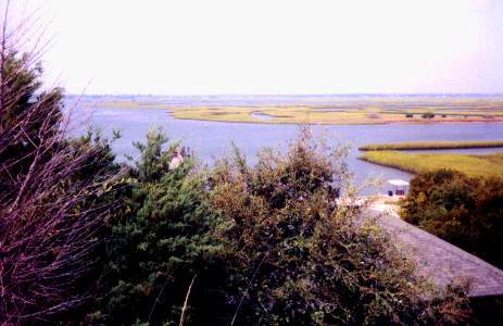 This picture shows the view back towards the mainland. From the top of a dune a person can see a large area of marshes.