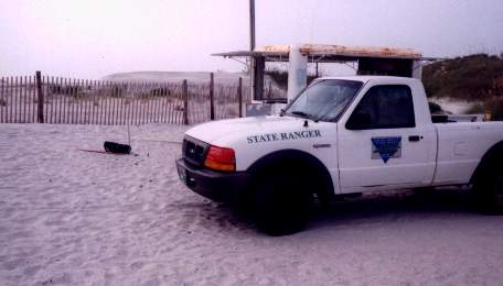The only vehicles on the island are owned by the park service. The headlights are covered with red tape so that the lights won't disturb sea turtles at night. The turtles can't see red light. The other islands along this section of coast are more developed, with lots of street lights, and sea turtles avoid those areas. Camping is prohibited on the Bear Island when sea turtles are nesting.