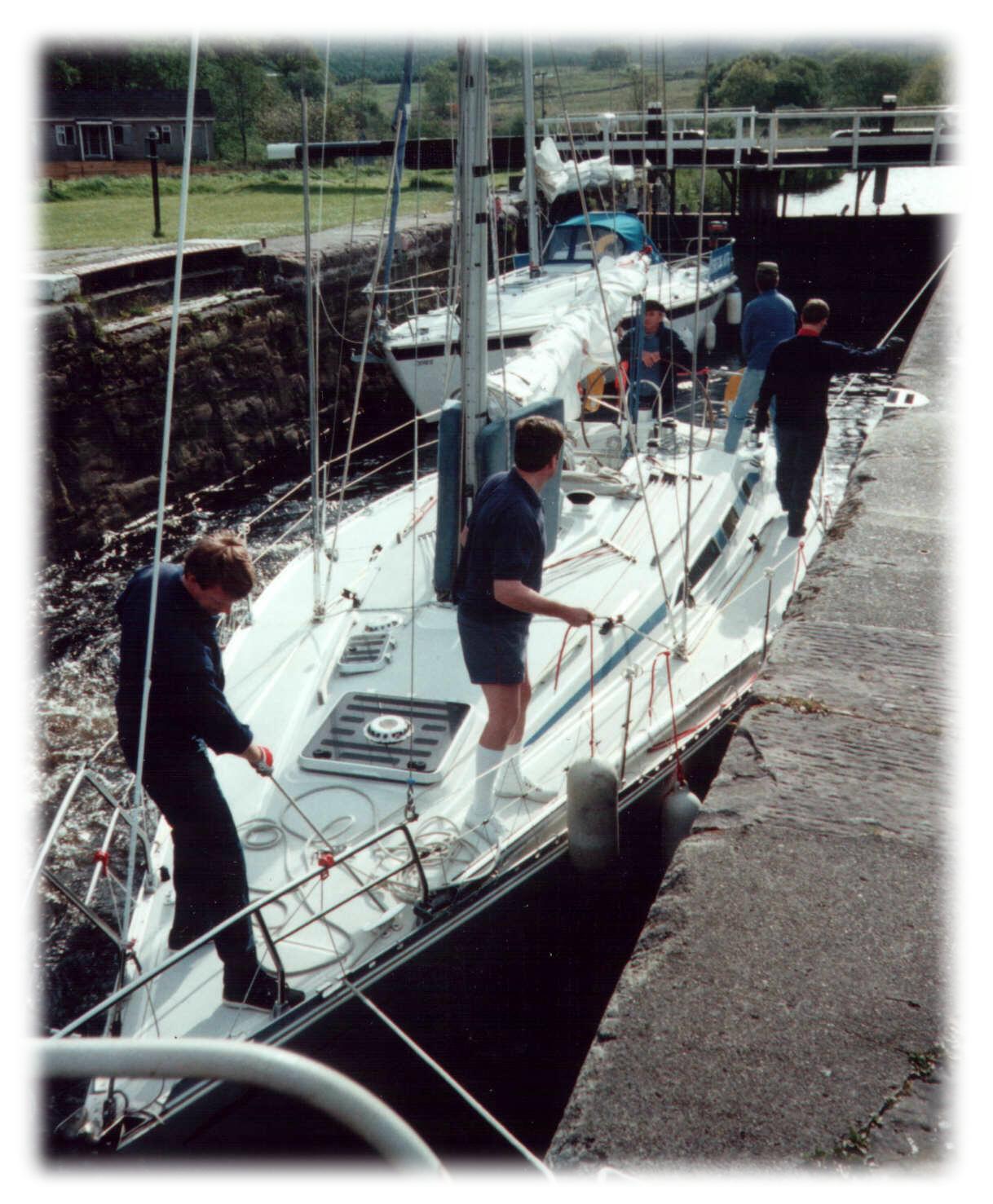 Taking 'Red Arrow' through a lock on the Caledonian Canal in Scotland during an RAF sailing expedition.