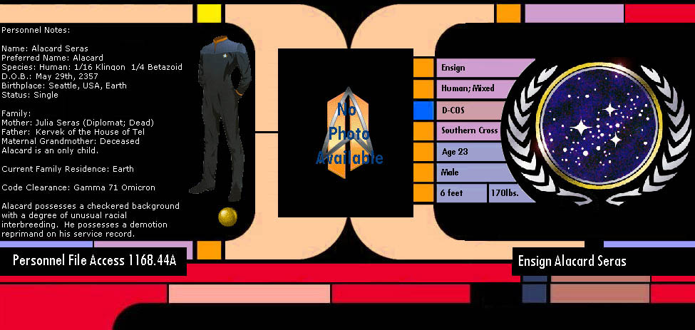 Personal History: Born on Earth in the city of Seattle. He was the only child from your average one parent family. His mom, who was half-Betazoid, worked with a diplomat, and was gone a lot. His father, mostly Human (about 1/8th Klingon) left the family when Alacard was still young. He couldn’t control his anger, and realized if he didn’t leave he might end up hurting Alacard or his mom. Alacard ended up staying with his Grandma a lot. She babysat him while his mom was away. His grandma was 100% Betazoid. Alacard loved his Grandma a lot, although she always caught him when he was lying. His Grandmother taught him to use his limited Betazoid powers. Alacard was always popular in school because of his ability to read peoples emotion and react to them accordingly. In middle school, he saw a shy little girl who was sitting in the back of the room. He was 13, she was 12 (she skipped a grade). Her name was Saeeda Raje. He made her laugh, and they became good friends. When his mother died in a ship explosion, he moved in with his Grandmother. He was 14 at the time. The loss of his mother hurt him deeply. Although she wasn’t always there for him, he cared for her. Alacard slipped into a deep depression that even his grandmother couldn’t help him. He stayed in his room for long hours reading whatever books he could get his hands on. He became interested in philosophy and martial arts. Dedicating all of his time into this, his grades dropped. He got into a lot of fights at school, and was suspended more than once. Saeeda was always there for him though. She tried to encourage him to stay in school, and at least get passing grades, which he managed to do. About a month after his 18th birthday, Alacard came home one night to find a couple of robbers in his house. After leaving them bleeding, they ran away. Alacard went to his Grandmother, who was attacked by the robbers. Using her last minutes of life, his grandmother placed her hands of Alacard’s head, and telepathically transferred what Alacard would later swear to his closest friend Saeeda was piece of mind. She understood she was going to die, and she had made piece with that. She wanted to make sure Alacard understood that. After his Grandmothers funeral, Alacard swore to make something of his life. He got straight A’s in his classes despite the fact he slacked off for years before. With a meager 2.5 GPA, Alacard couldn’t get into any good colleges. Feeling hopeless, he was going to accept an invitation to a lesser college when Saeeda told him that Star Fleet Academy was accepting applications for students interested in Security. He applied and took the entrance exams. To his surprise, they accepted him. Also attending the same academy was Saeeda to his pleasure. They had hardly any classes together as they were in two different programs. Alacard’s scores were little above average, but he excelled in combat and strategy. Graduating after 4 years, he was stationed at Deep Space 5. He was promoted to Lieutenant, junior grade for excellent service in under a year. About 6 months after his promotion, he got in a fight with the Deputy Security Officer. Officially the officer, who was a Klingon intimidated by Alacards fighting skills, stuck first. Alacard ignored the challenges of the Deputy Security Officer, so the Klingon called him a mixed up bastard. The Klingon then struck at Alacard, and Alacard began to fight back. The fact that Alacard broke a few of his bones was frowned upon by Star Fleet. Alacard was demoted to Ensign, and was reassigned to the USS Southern Cross. He accepted the position as Deputy Chief Officer on the USS Southern Cross, and took the first shuttle headed where it was docked.