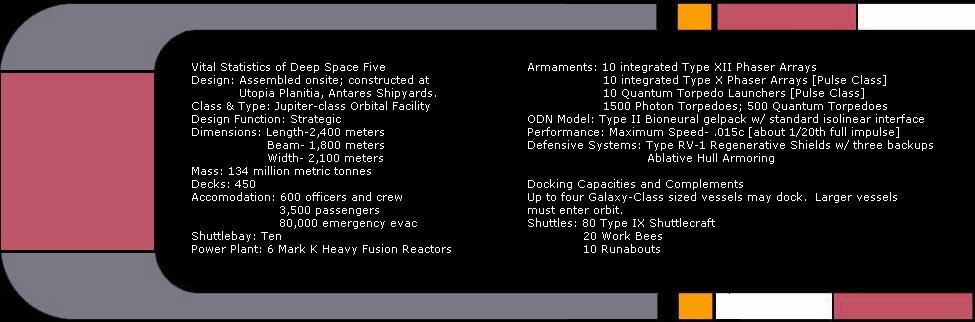 Starbase Deep Space Five is the hub of commercial and military traffick coming in and out of the Typhon and Argolis sectors. Its future timetable intends it to be the hub of commerce for most of the Argolis Reach region. However, at the present time, Deep Space Five is little more than a communications relay, refueling depot and military outpost on the edge of Federation space. Her primary mission is to support craft in the area and to watch for any sign of Borg invasion.