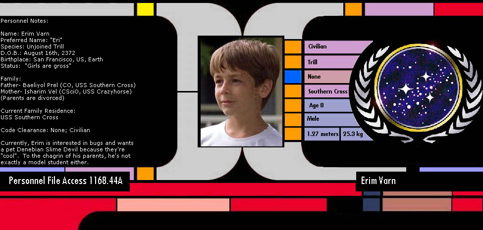 Likes: Bugs, playing on the holodeck and in the various rec rooms. Likes to collect seaship models. He's fond of sneaking into places that he knows he shouldn't be in. He spends most of his free time in the bio lab or the small Water Garden on Deck Four. He also has an ant farm. He's totally obsessed over bugs.