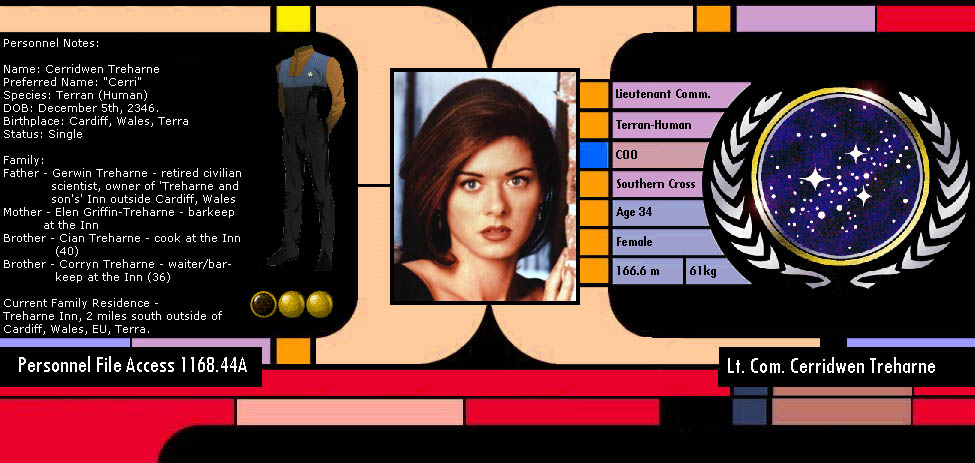 Tours of Duty: After graduation, Treharne moved to the USS Kamarov as Transporter Operator. Following several good ideas and rescues of certain officers, Cerridwen moved up to Lieutenant Junior Grade in 2369, and became the Deputy Chief of Operations on the Kamarov. 2370. earned her the rank of Lieutenant and a transfer to the USS Ballentyne. The Ballentyne was shoved to the first lines of battle when the war began and was one of the few ships to return from several battles. During the first year of war, she was promoted to Lieutenant Commander and moved to Chief of Operations. In 2374, several months before the war ended, the Ballentyne was destroyed and the survivors taken as prisoner's of war. Fortunately, those 20, who'd survived were released after the war ended. Cerridwen was reinstated to full duty a year later after rehabilitation. She was transferred to USS Kurosawa and remained there as COO until 2380. when she was transferred to the USS Southern Cross, as Ops Chief and Second Officer.