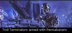 The battle continued for years with both sides scoring victories in there own right. You learned to stay down by day, but at night you can move around. The Hunter-Killers or H-K’s use infra-red so you still have to watch out. But they're not too bright. That's when the infiltrators started to appear. The Terminators were the newest, and the worst...armed with permbaners they began to sway the flag of victory to the machines. The Terminators could blend in with normal posters and were armed with permabaners they spread throughout cyber space intent on destroying Trolls and controlling the general poster population.