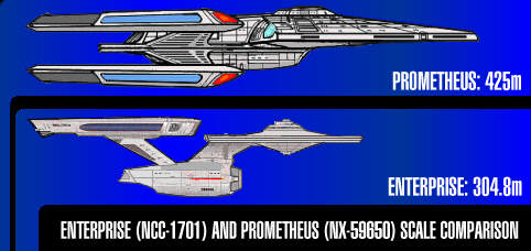 This is a comparison of a Prometheus class starship to an original sized Constitution class starship.