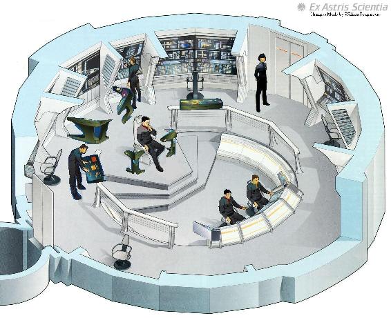 The battle bridge is normally only tasked with control over the stardrive module however it can be used to command the entire ship if the Main Bridge is damaged or disabled. Like the Main Bridge, the battle bridge is supported by an adjacent Ready Room and Conference Room.