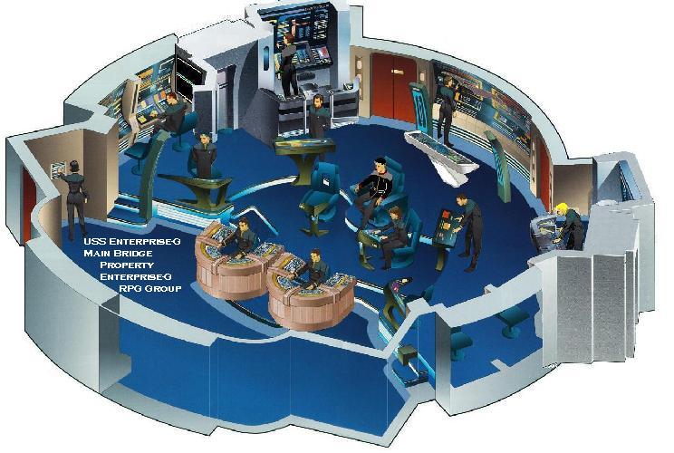 The primary Bridge configuration of the Enterprise class is based upon the successful Sovereign Class Main Bridge design. Incorporating the addition of several new console designed, the Enterprise Class Bridge module is currently considered to be the most efficient design available at present time. The Main Bridge command stations provide seating and information