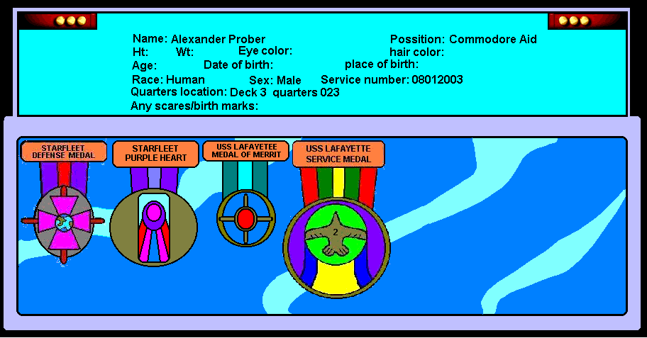 Service Record:Served on the USS Dakota as security officer and USS Comanche as Asst Security Chief. Alex has no memory of how he was the only survivor of the loss of the Comanche. He was recovered from an escape pod found where the Comanche and Dakota disappeared. Commodore Gordon and Captain Savage both annotated in his files what an excellent officer he was.