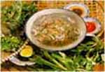 rice. This dish includes Chinese vermicelli, Bamboo shoots, lean pork meat, and an assortment of green vegetables (banana leaves, mint, star fruit, etc.).
