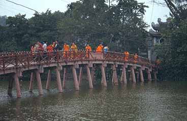 Hoan Kiem LakeHo Hoan Kiem (Lake of Restored Sword) : The name of this lake is derived from a legend having it that a fisherman named Le Than caught a sword blade when drawing the fish-net. Than decided to offer it to his commanding general Le Loi (future Le Thai To). Afterwards, Le Loi found a hilt fitting that blade very well. This sword had always been on his side during 10 years of resistance against Ming aggressors. After winning over the foreign aggression, King Le Thai To returned to Thang Long Citadel. One day, aboard a royal boat, he took a cruise in the Luc Thuy lake. Suddenly, a giant turtle emerged and came towards him. The king withdrew his sword, and pinpointed with the sword the direction of the coming turtle for his soldiers' attention. All of a sudden, the turtle caught the sword between its teeth from the king's hand and submerged. The king thought that during the resistance against Ming aggressors, the genius had offered him this sword to help him defeat the enemy. At that time, the peace was returning, and the genius appeared to take back the sword. Consequently, King Le Thai To decided to name the Luc Thuy lake Ho Hoan Kiem (Lake of Restored Sword). In the middle of the lake is Thap Rua (Turtle Tower). The lake abounds in big turtles aged five or six hundred. When there are the changes in weather, they often emerge or expose themselves at the foot of the Turtle Temple. |