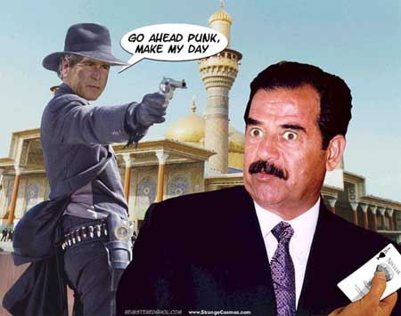 Since I'm the only one in the street with a decent range of automatic firearms, I reckon it's up to me to keep the peace. But until recently that's been a little difficult. Now, however, George W. Bush has made it clear that all I need to do is run out of patience, and then I can wade in and do whatever I want!
