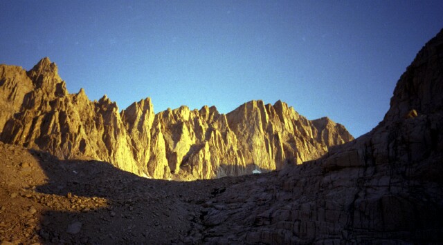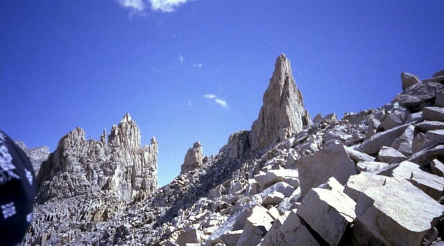 On this natural high, the next few miles seemed to glide by. After a short dip down to meet the JMT, the Whitney trail soon resumes a modest climb up to the backside of the needles. The views to the east are now obstructed by the bulk of the mountain save for a few treacherous “windows” which open uncomfortably close to the edge of the trail. We skirted them cautiously, pausing only briefly at each to admire the view. We sensed that nothing should to break our rhythm. We could feel the peak drawing near with each passing step. We could taste it.
