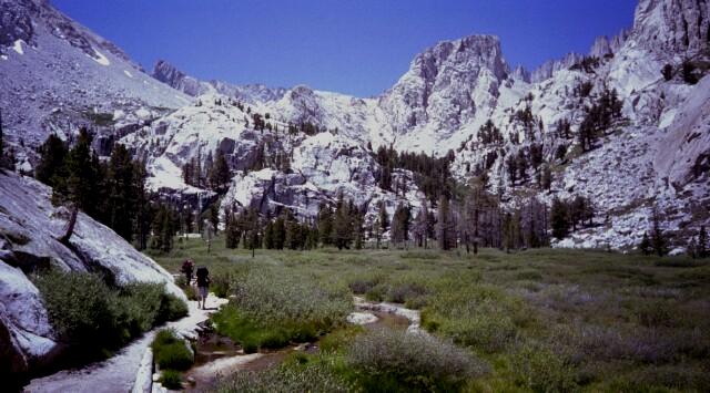 Everything is bigger in California! Yes, I know, that slogan originated in a place they call Texas. But when you’re talking mountains or pancakes for that matter, California is the place you ought to be. We would need those calories in a hurry as we began our ascent of this formidable mountain. While certainly not the steepest grade I have ever encountered, the dusty trail up and out of the portal starts at 8,500 feet. With full packs and warm temps, it didn’t take long for the sweat to flow. So easy is it to be overwhelmed by the grandeur around you, that the first few miles to Lone Pine Lake pass relatively quickly. The trail climbs a bit past the lake before leveling out a spectacular meadow near the Outpost Camp. From a previous hike in the next valley over (Meyson Lake) I knew how verdant these mountains could be in the presence of water. The area from Lone Pine Lake to Mirror Lake is lush. As if to showcase this bounty, a spectacular waterfall gushes forth amid the Jeffery Pines near the camp. Scenes like this are quite a contrast to the arid Owens Valley, which is almost always within eyeshot to the East.