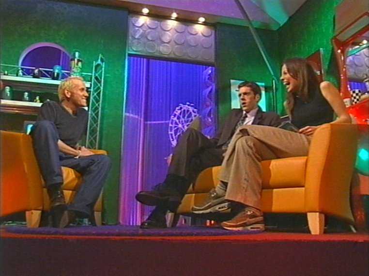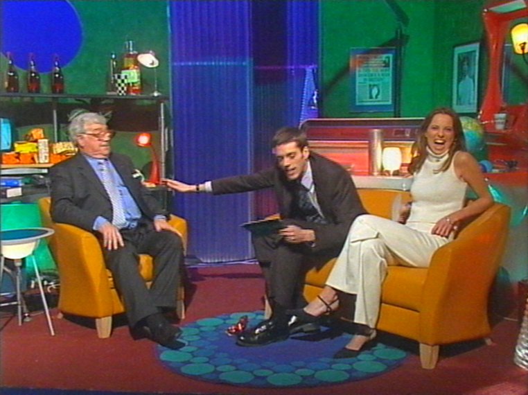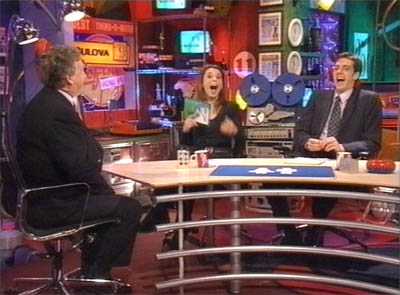 One interesting point to note is that the studio interviews last considerably longer than what is actually broadcast. On average, the broadcast studio interview lasts for two to three minutes. How do I know? The Frank Carson interview at the Christmas Special tapings was probably the best part of the show and lasted over five minutes. Only 45 SECONDS were broadcast, although a lot of the material was very controversial and/or raunchy. The Nick Leeson interview lasted around five minutes at the tapings, and a large chunk was cut of the beginning to make it last around two and a half minutes for the broadcast. This just goes to show how much you miss not being at the tapings!