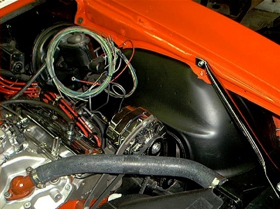 Inside picture of right fender. Heater hoses are routed.
