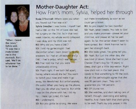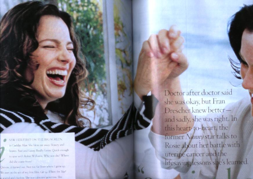 FD: No. It’s on my mind. I was home waiting for my karate instructor to come to the house when I got a call from the doctor. And she says, “You know, Fran, I thought about calling you into the office, but then I thought you would only get nervous and why belabor this? Your tests came back positive. I’m so shocked, I can’t even tell you. You have an adenocarcinoma.” And I said, “Wait a minute, let me write this down.” here’s a tip: As soon as they start talking to you about something specific, get a pen and paper. Do not just listen, because your head is reeling. And I’m writing it down, and I say, “Now what is this exactly?” She said, “It’s uterine cancer.” I start to cry. She said, “Oh, Fran, I’m so sorry. Let me just say it’s at a very, very early stage. It is 100 percent curable.” She said she was setting me up with a woman who is a gynecological oncologist and that she’d see me on Thursday. This was a Monday.