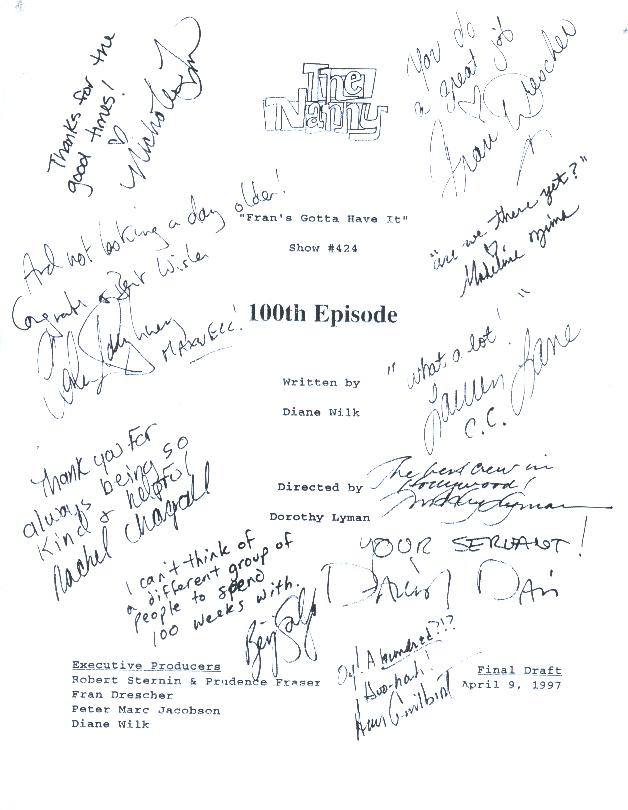 1.1 Pilot (Table Draft) 1.1 Pilot (Revised Final Draft) 1.2 Smoke Gets in Your Lies (Rev. 1st Draft) 1.3 My Fair Nanny (Rev. 1st Draft) 1.4 The Nuchshlep (Table) 1.5 Here Comes the Brood (2nd Draft) 1.6 The Butler, The Husband, The Wife, and Her Mother (Rev. 1st Draft) 1.7 Imaginary Friend (Final Draft) 1.8 Christmas Episode (Final Draft)