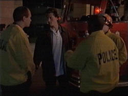 A CROWDED NIGHTTIME STREET. SIRENS BLARE. COPS KEEP A MILLING CROWD BACK ON THE SIDEWALK. ED WALKS PAST A FIRE ENGINE AND SPEAKS TO A POLICEMAN.