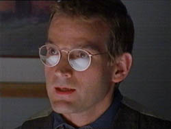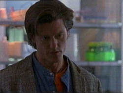 AT THE BIO LAB. IN ATTWOOD’S OFFICE. ATTWOOD SITS AT HIS DESK, SLOAN STANDS IN A CORNER AND ROGER YOUNG STANDS NEAR THE INTERIOR WINDOW.