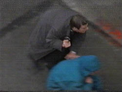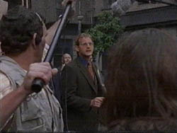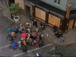 THE UMBRELLA WOMAN FIRES HER MICROPHONE. IT IS A GUN IN DISGUISE. THE REPORTERS ALL DROP TO THE GROUND. SLOAN GASPS AS ROGER IS SHOT. TOM RUSHES OVER AS SLOAN JOINS HIM AND ATTWOOD BESIDE ROGER.