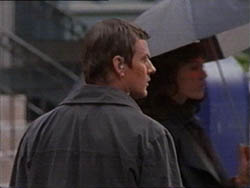 A CAR DRIVES UP A WET STREET (EL NINO STRIKES AGAIN), TOWARDS TWO MEN. A FILM CREW RACES ACROSS THE STREET AS THE CAR PARKS. ONE OF THE MEN OPENS THE CAR DOOR AND ATTWOOD GETS OUT. ROGER GETS OUT OF THE PASSENGER SIDE AND THEY WALK DOWN THE STREET.