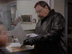 COPELAND STARTS REALLY HORKING AND TOM AND SLOAN BACK AWAY TOWARDS THE DOOR. HANDSOME AIMS A GUN AT TOM, HALTING HIM.