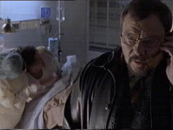 DAYTIME. AT THE HOSPITAL. A NURSE CHECKS ON ED. HE LOOKS BAD, ALL SWEATY AND COUGHING. ATTWOOD STANDS LOOKING OUT THE WINDOW. HE TURNS AND LOOKS OVER AT ED.