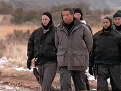 WE SEE A BUNCH OF TROOPS IN CAMOUFLAGE FATIGUES WALK UP BEHIND TOM AND ATTWOOD. CARL AND THE REST OF THE GUARDS WALK UP AND LINE UP ACROSS FROM THEM, STAND-OFF LIKE. THEY ALL HAVE THEIR HANDS BEHIND THEIR BACKS, HANDCUFFED.