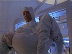 COPELAND PUSHES APART THE CLEAR PLASTIC FLAPS AND ENTERS THE AREA WITH THE CRYOGENICALLY FROZEN SAMPLE. SLOAN FOLLOWS HIM IN AND HE REMOVES THE SAMPLE FROM ITS CHILLY CONTAINER. SLOAN CAUTIOUSLY PLACES IT ON THE COUNTER.