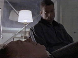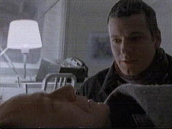 AT THE HOSPITAL. IN ED’S ROOM. SLOAN WATCHES OVER ED, HIS BREATHING RASPY. TOM WALKS PAST THE WINDOW AND STANDS IN THE THRESHOLD, LOOKING IN AT SLOAN. HE ENTERS AND WALKS OVER TO HER, TOUCHING HER SHOULDER. SLOAN TURNS AND LOOKS UP AT HIM.