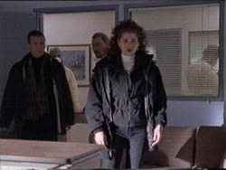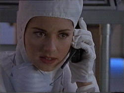 (WOW, SOME REALLY NICE SHOTS OF THOSE BABY BLUES.) TOM MOTIONS FOR SLOAN TO GO. SHE WALKS PAST CARL, AND TOM FOLLOWS HER, CARRYING A CASE HOLDING THE VACCINE. CARL LETS THEM PAST.