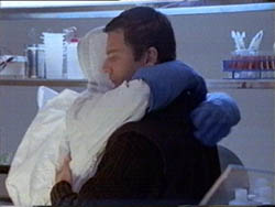 DAYTIME. AT THE ENCAMPMENT. IN THE LAB TENT. VARIOUS SCIENTISTS WORK AT COMPUTERS AND OTHER MACHINES, WHILE ONE HELPS COPELAND INTO HIS ALASKAN POTATO SACK. SLOAN, IN HER OWN POTATO SACK, WALKS OVER TO TOM AND PUTS HER ARMS AROUND HIM. HE HUGS HER.