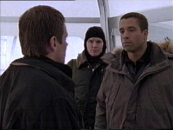 CUT TO A BIT LATER, SLOAN AND COPELAND STAND WITH THEIR HOODS REMOVED.